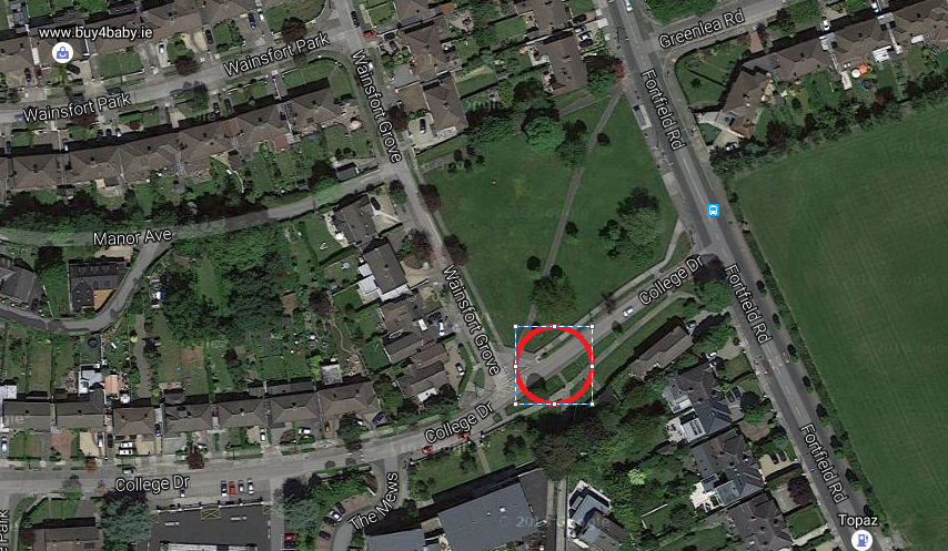 The relevant section of parkland is within the boundaries of Old Bawn Rd., Firhouse Rd.,the pedestrian bridge over the Dodder and the River Dodder itself.