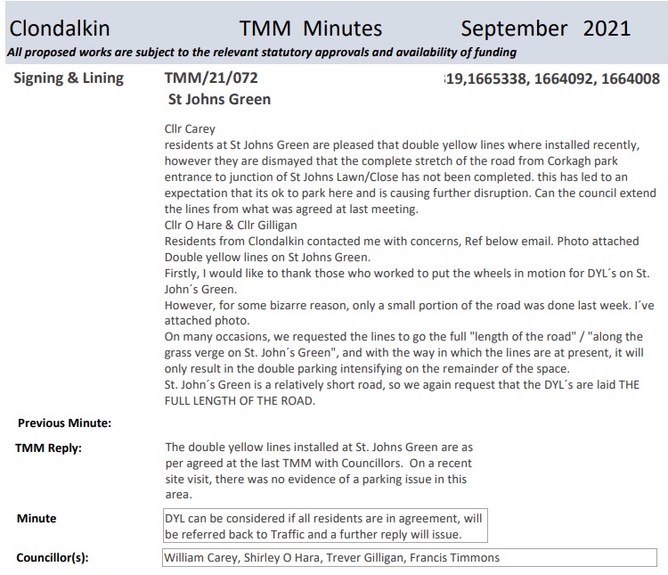 "To ask the Chief Executive for an update on the completion of double yellow lines at St. John's Green and when they can expect to be completed as agreed at Traffic Management Meeting?"