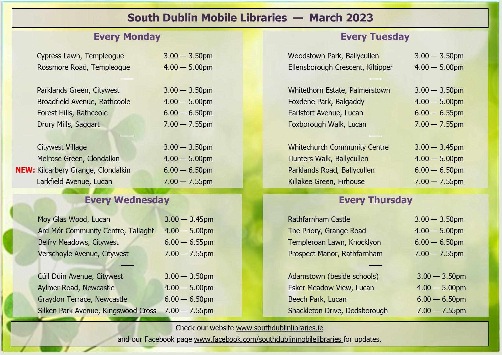 To ask the Chief Executive if there is a regular schedule for the mobile library and if St Johns Drive, Greenpark and Cherrywood crescent are still locations for the service.