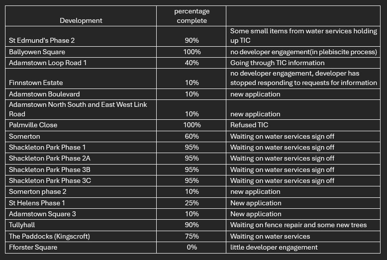 To ask the CEO to report on the status of taking in charge within the LEA, indicating whether each estate has been taken in charge or not, where estates have been taken in charge, please provide the date it was taken in charge; where not taken in charge, please outline the current status of the taking in charge process, including an estimated timeframe for when the process is expected to commence and conclude.