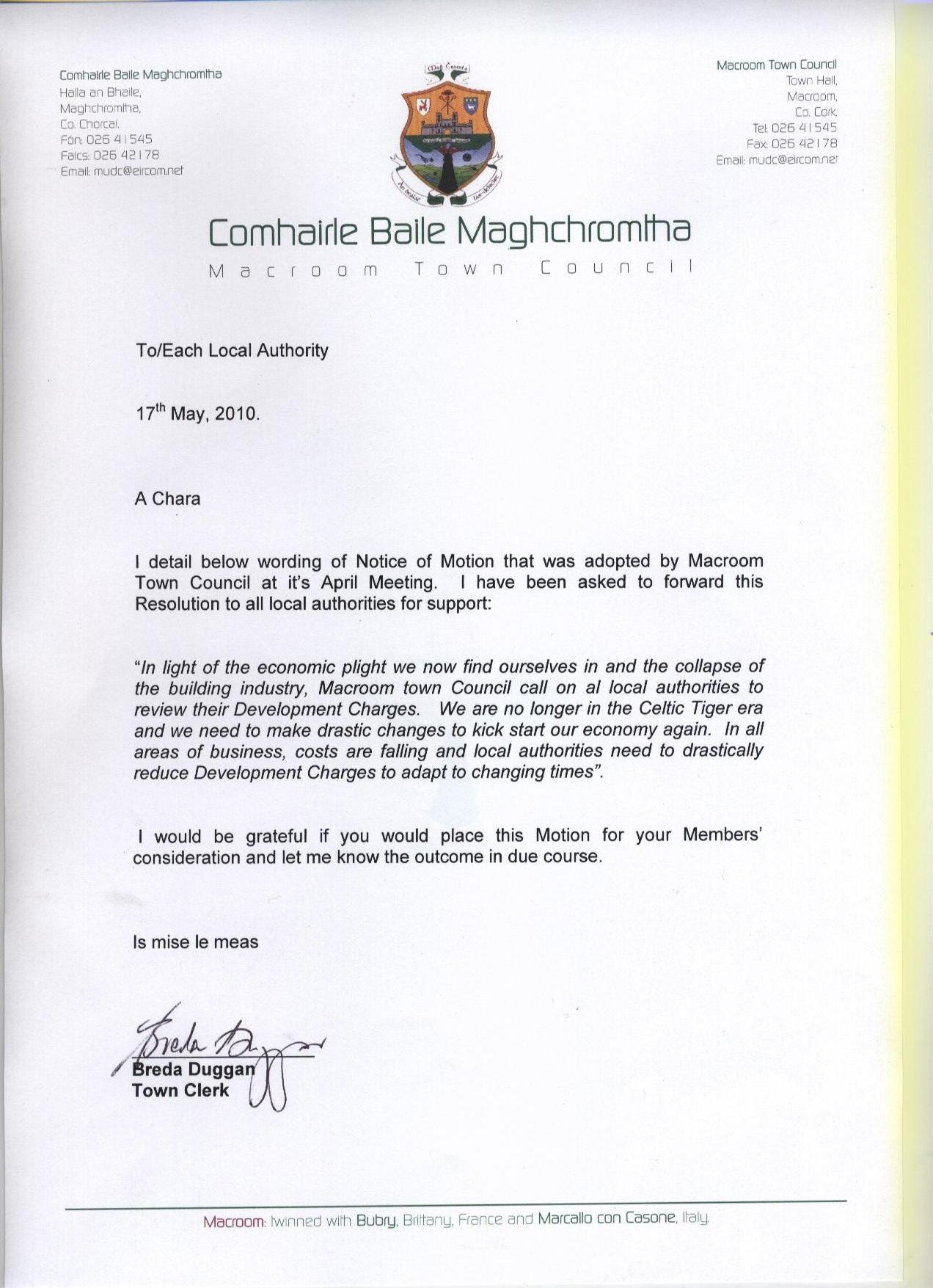 Correspondence, dated 17th May 2010, from Macroom Town Council calling for review of Development Levies