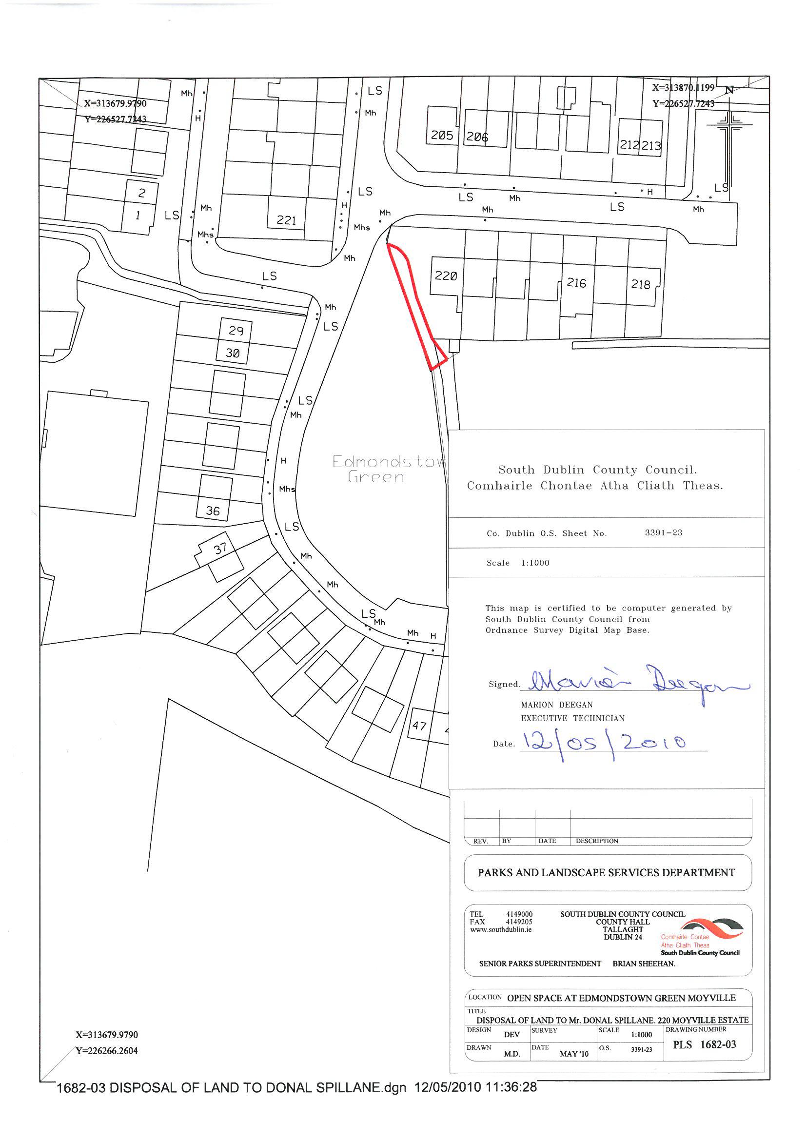 g) Proposed disposal of strip of land adjacent 220 Moyville Estate, Rathfarnham, Dublin 16 to Donal & Bridget Spillane