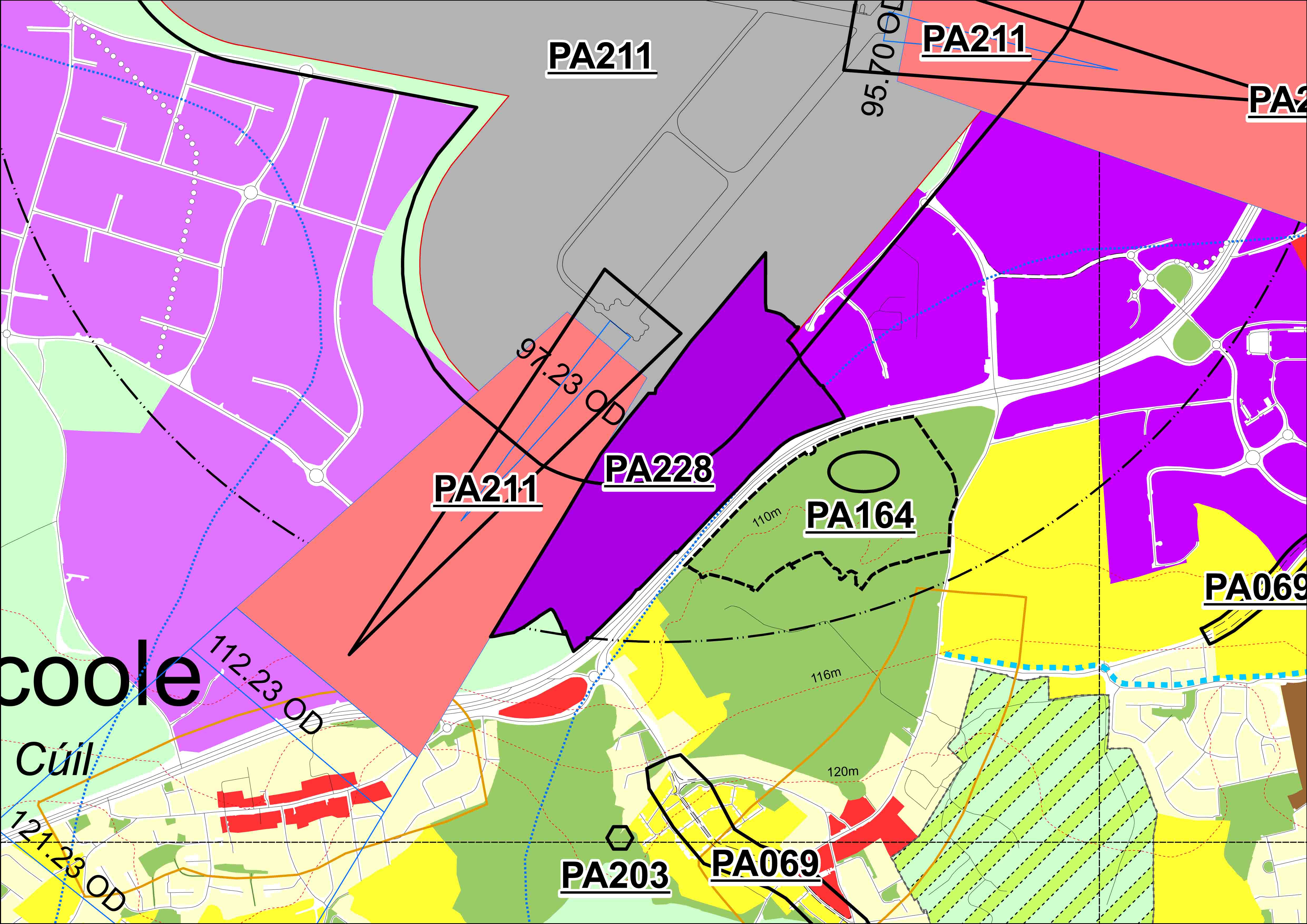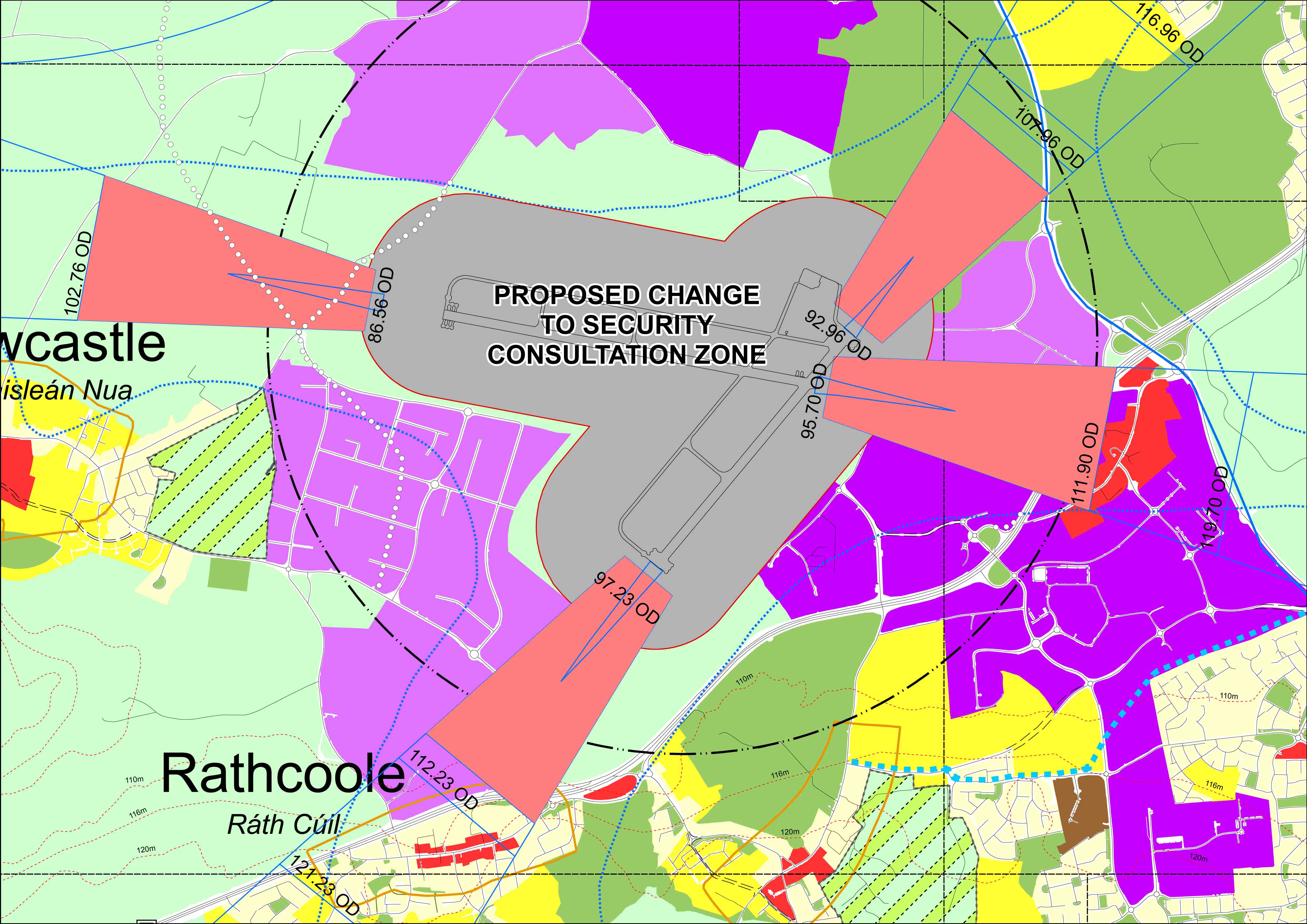 To modify the Draft County Development Plan Index Map/ Map 3 to reduce the area of the ‘Security Consultation Zone’ to approximately 300 metres west from the edge of Runway 05/23. (For the avoidance of doubt, this area is not to be taken from the edge of the taxiway). This is in accordance with Policy EE39A of the Amended Draft County Development Plan. The flight safety zones (red zones) shall remain